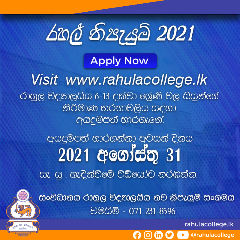 Jul202021 A design competition for grade 6 – 13 students of Rahula CollegeDeadline: 20ᵗʰ August 2021 More Info Introduction Video Apply Now Related Categories: Featured, Grade 12- 13, Grade 6 - 11, Notice BoardJuly 20, 2021 Share this post Share on FacebookShare on Facebook Share on LinkedInShare on LinkedIn Share on XShare on X Share on WhatsAppShare on WhatsApp Related PostsCongratulations! | Rahula College President’s Scouts 2024July 23, 2025Congratulations! | G. C. E. Advanced Level 2024July 16, 2025G.C.E. O/L 2024(2025) Results SummaryJuly 13, 2025Vote for Rahula College – BestWeb.lk 2025July 8, 2025Binuda Bojitha Dominates Junior National Athletic Championship 2025 with Double GoldsJune 21, 2025Dinujaya Honoured with National Chess AwardsJune 4, 2025