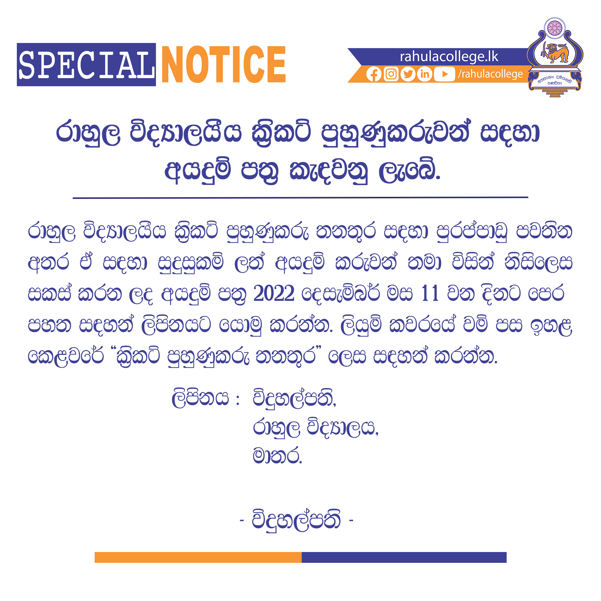 Dec62022 Related Categories: Featured, Grade 1 - 5, Grade 12- 13, Grade 6 - 11, Notice BoardDecember 6, 2022 Share this post Share on FacebookShare on Facebook Share on LinkedInShare on LinkedIn Share on XShare on X Share on WhatsAppShare on WhatsApp Related PostsCongratulations! | Rahula College President’s Scouts 2024July 23, 2025Congratulations! | G. C. E. Advanced Level 2024July 16, 2025G.C.E. O/L 2024(2025) Results SummaryJuly 13, 2025Vote for Rahula College – BestWeb.lk 2025July 8, 2025Binuda Bojitha Dominates Junior National Athletic Championship 2025 with Double GoldsJune 21, 2025Dinujaya Honoured with National Chess AwardsJune 4, 2025