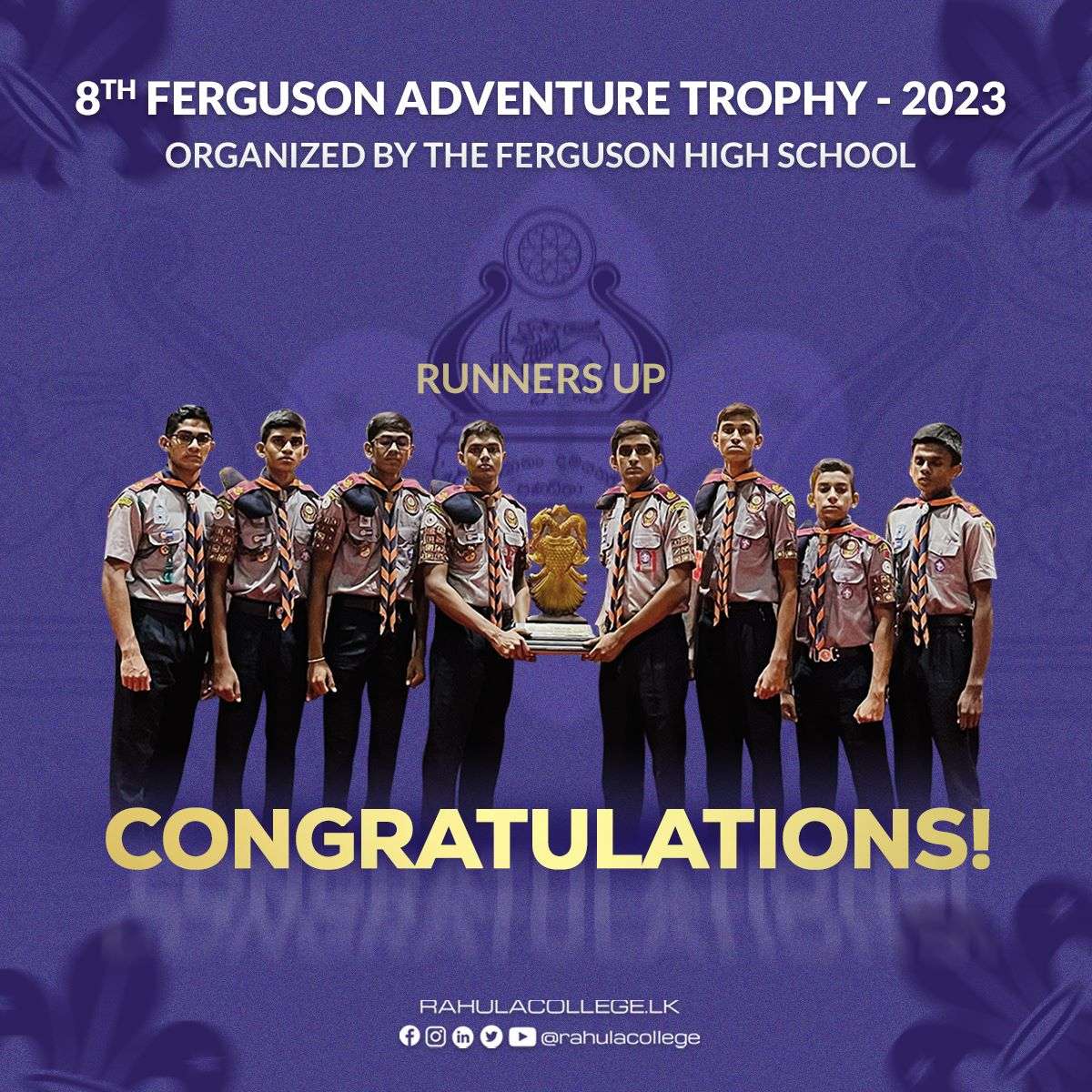 Jul262023 Congratulations Rahula Scout Troop on winning the runners up in the 8th Ferguson Adventure Trophy 2023 organized by Ferguson High School. Related Categories: Featured, Grade 1 - 5, Grade 12- 13, Grade 6 - 11, Notice BoardJuly 26, 2023 Share this post Share on FacebookShare on Facebook Share on LinkedInShare on LinkedIn Share on XShare on X Share on WhatsAppShare on WhatsApp Related PostsCongratulations! | Rahula College President’s Scouts 2024July 23, 2025Congratulations! | G. C. E. Advanced Level 2024July 16, 2025G.C.E. O/L 2024(2025) Results SummaryJuly 13, 2025Vote for Rahula College – BestWeb.lk 2025July 8, 2025Binuda Bojitha Dominates Junior National Athletic Championship 2025 with Double GoldsJune 21, 2025Dinujaya Honoured with National Chess AwardsJune 4, 2025