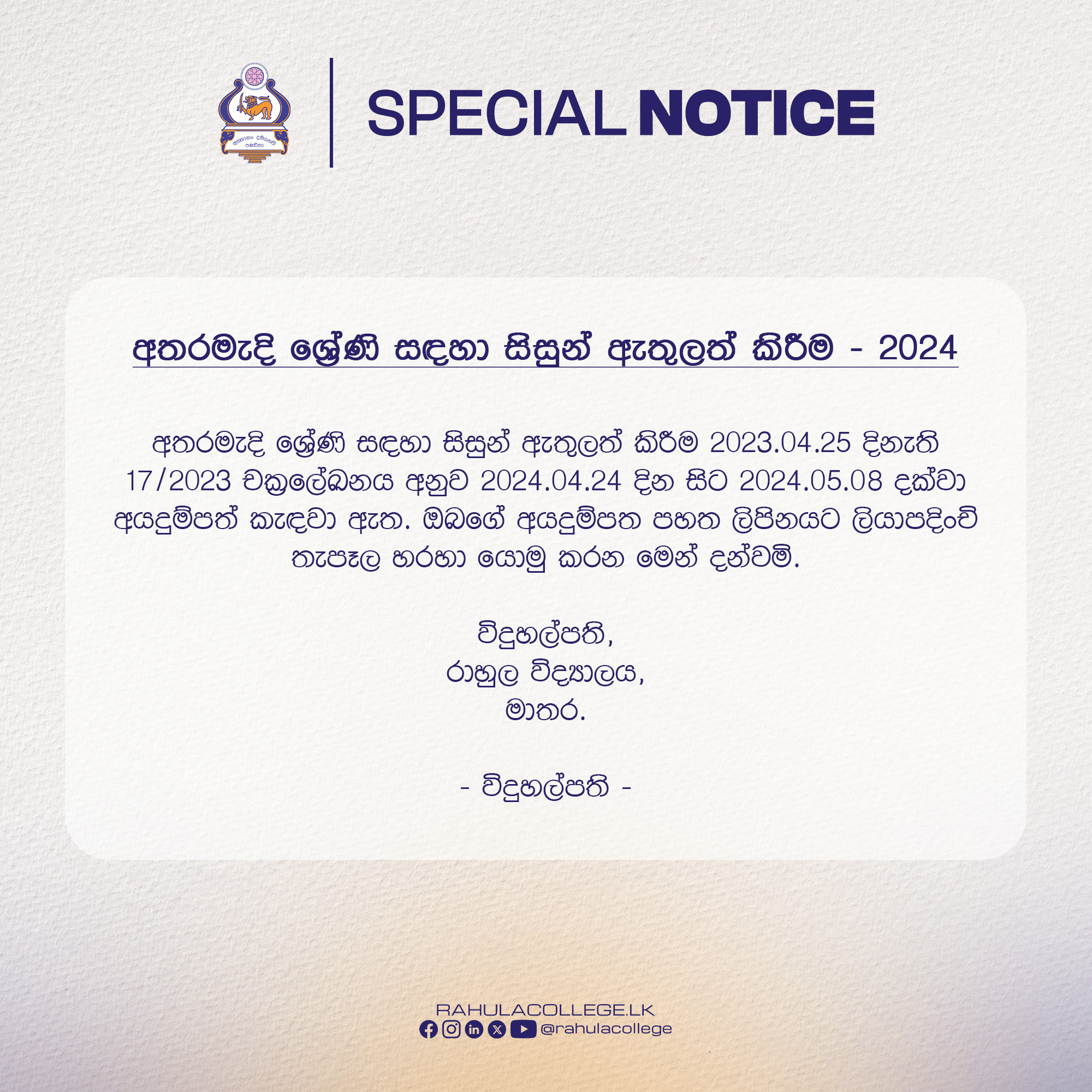 May52024 Related Categories: Featured, Grade 1 - 5, Grade 12- 13, Grade 6 - 11, Notice BoardMay 5, 2024 Share this post Share on FacebookShare on Facebook Share on LinkedInShare on LinkedIn Share on XShare on X Share on WhatsAppShare on WhatsApp Related PostsCongratulations! | Rahula College President’s Scouts 2024July 23, 2025Congratulations! | G. C. E. Advanced Level 2024July 16, 2025G.C.E. O/L 2024(2025) Results SummaryJuly 13, 2025Vote for Rahula College – BestWeb.lk 2025July 8, 2025Binuda Bojitha Dominates Junior National Athletic Championship 2025 with Double GoldsJune 21, 2025Dinujaya Honoured with National Chess AwardsJune 4, 2025
