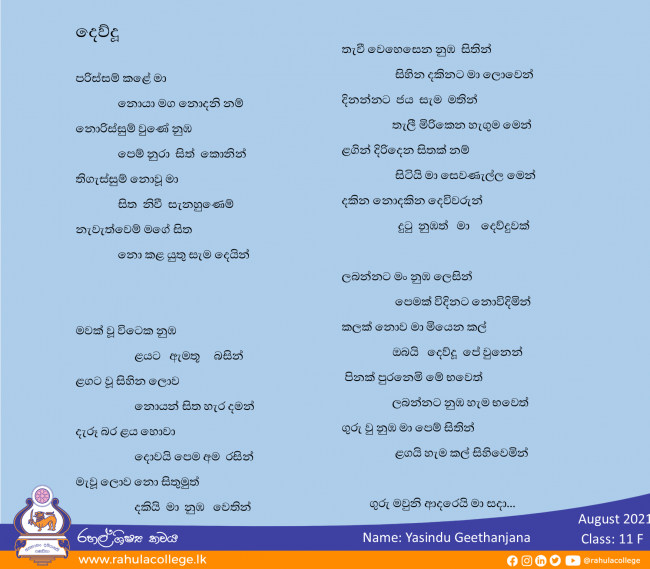 ZoomDetails දෙව්දූPoetryBy Rahula Web TeamAugust 31, 2021Leave a commentYasindu Geethanjana Class: 11 F