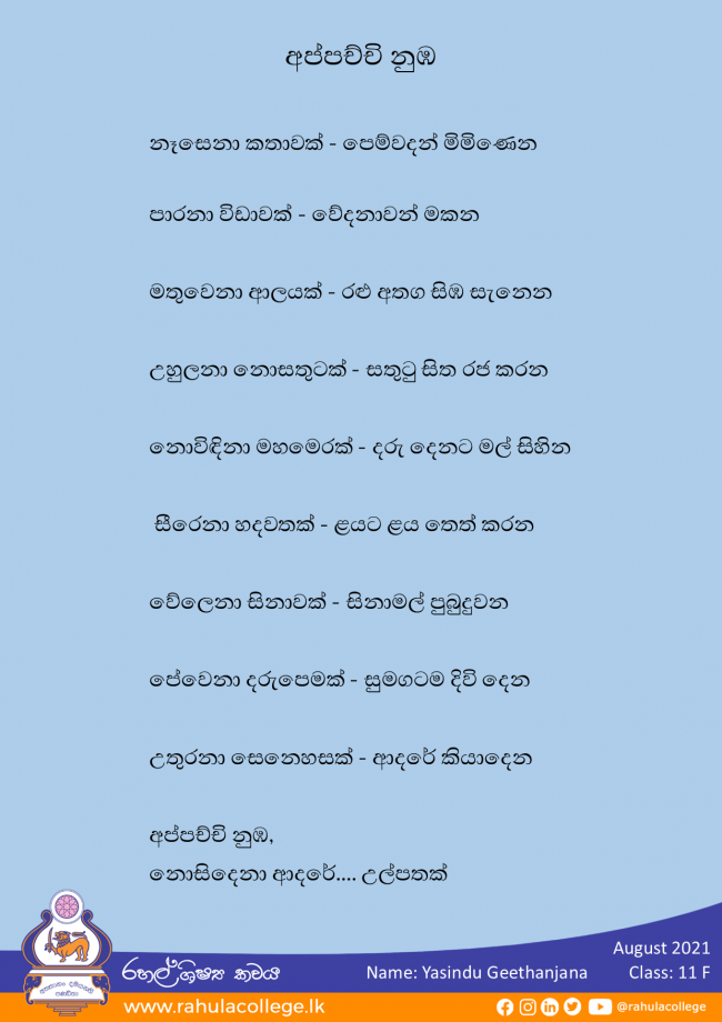 ZoomDetails අප්පච්චි නුඹPoetryBy Rahula Web TeamAugust 31, 2021Leave a commentYasindu Geethanjana Class: 11 F