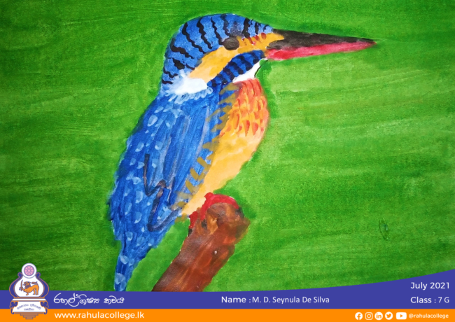 ZoomDetails මල් පිළිහුඩුවා – Common KingfisherArtsBy Rahula Web TeamJuly 4, 2021Leave a commentM. D. Seynula De Silva Class: 7 G