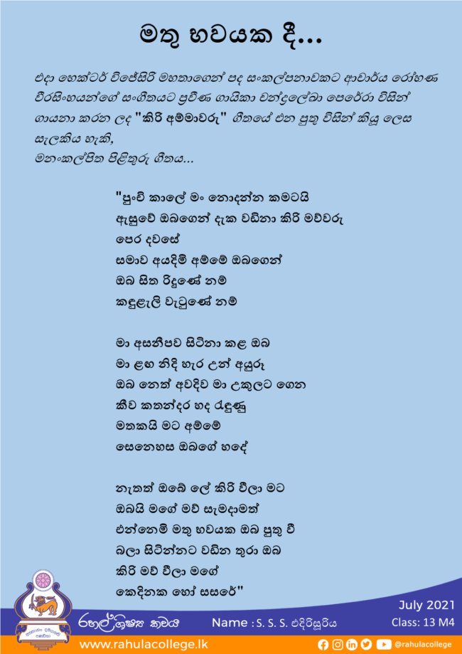 ZoomDetails මතු භවයක දී…PoetryBy Rahula Web TeamJuly 5, 2021Leave a commentS. S. S. එදිරිසූරිය Class: 13 M4