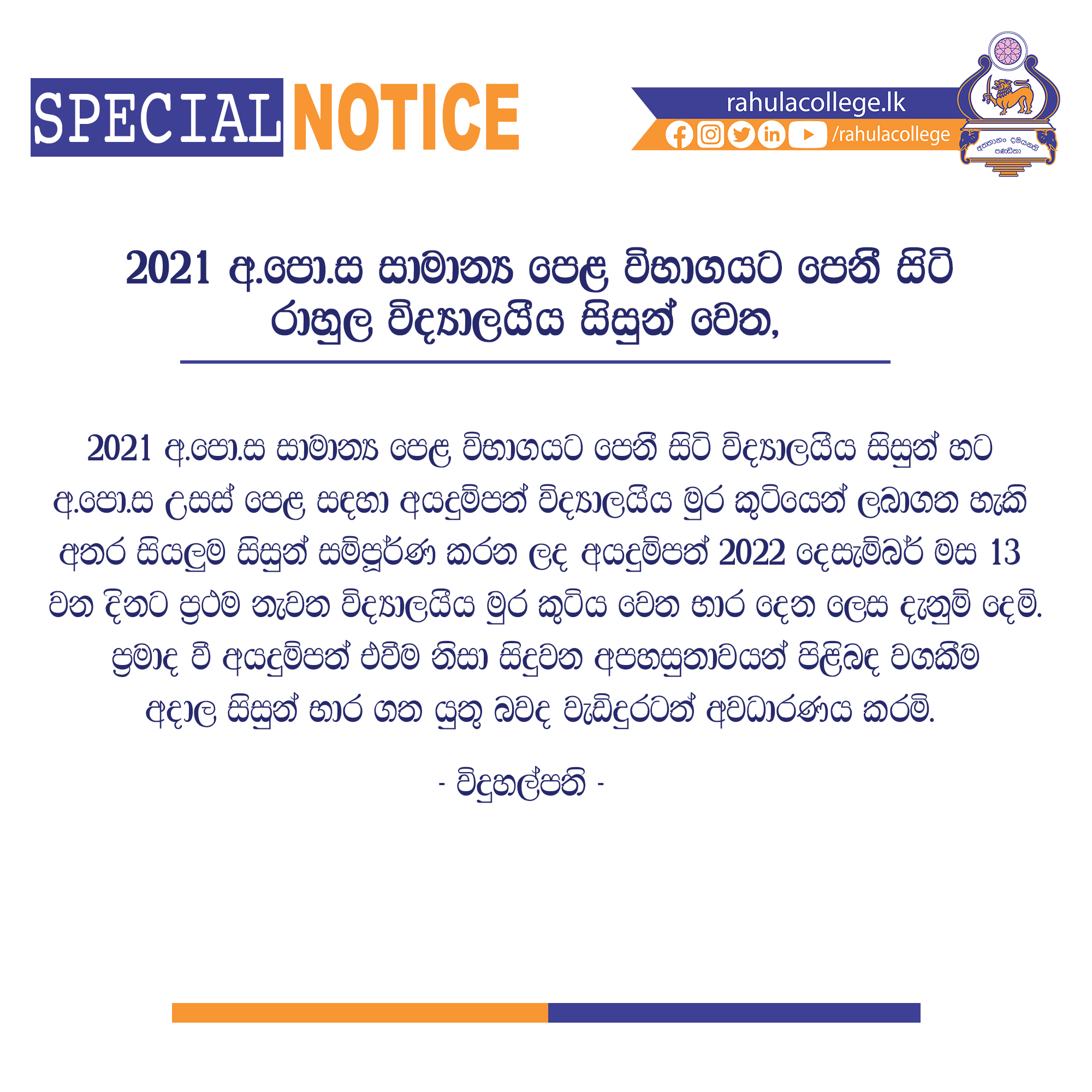 නොවැ.302022 Related Categories: 1 - 5 ශ්රේණි, 12 - 13 ශ්රේණි, 6 - 11 ශ්රේණි, දැන්වීම් පුවරුව, විශේෂාංගනොවැම්බර් 30, 2022 Share this post Share on FacebookShare on Facebook Share on LinkedInShare on LinkedIn Share on XShare on X Share on WhatsAppShare on WhatsApp Related Postsරාහුල විද්යාලීය ජනාධිපති බාලදක්ෂ පදක්කම්ලාභීන් 2024ජූලි 23, 2025උණුසුම් සුබ පැතුම්! | අ.පො.ස. උසස් පෙළ 2024ජූලි 16, 2025අ.පො.ස සාමාන්ය පෙළ 2024(2025) ප්රතිඵල සාරාංශයජූලි 13, 2025බිනුද බොජිත ජාතික කනිෂ්ඨ මලල ක්රීඩා ශූරතාවලිය 2025 රන් පදක්කම් දෙකකින් ආලෝකවත් කරයිජූනි 21, 2025දිනුජය ජාතික චෙස් සම්මානවලින් පිදුම් ලබයිජූනි 4, 2025අ.පො.ස. උසස් පෙළ 2024 | ඉහළ සාමාර්ථමැයි 14, 2025