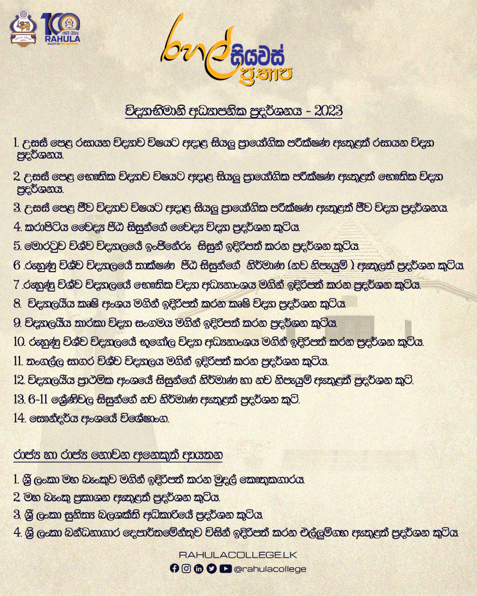 රහල් සියවස් ප්රතාප විද්යාභිමානි ප්රදර්ශනය 2023 අප්රේල් මස 25, 26 සහ 27 යන දිනයන් හීදී විද්යාලයීය පරිශ්රයේදී පැවැත්වේ.