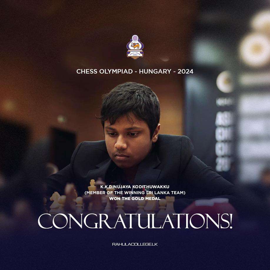 හංගේරියාවේ පැවැත්වුණු චෙස් ඔලිම්පියාඩ් තරගයට ශ්රී ලංකාව නියෝජනය කරමින් ජාතික කණ්ඩායමට රන් පදක්කමක් ජයග්රහණය කළ K.K දිනුජයට රාහුල විද්යාලයෙන් උණුසුම් සුබ පැතුම්!