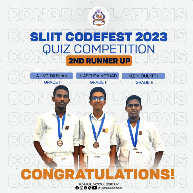 SLIIT Codefest තරගාවලියෙන් දෙවන අනුශූරතාව දිනාගත් රාහුල විද්යාලයේ ඒ.ජේ.වී.ටී ඩිල්ෂාන්, එච්. අසේන්ද නේතාද් හා එම්,බී,එන් දුල්කිත් හට අපගේ උණුසුම් සුභ පැතුම්!