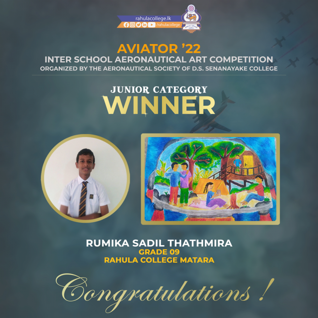 කොළඹ ඩී.එස්. සේනානායක විද්යාලයීය ගුවන් පියාසර සංගමය විසින් සංවිධානය කරන ලද අන්තර් පාඨශාලීය චිත්ර තරගයේ කණිෂ්ඨ අංශයේ ප්රථම ස්ථානය රාහුල විද්යාලයීය 9 ශ්රේණියේ ඉගෙනුම ලබන රුමික සදිල් විසින් දිනාගන්නා ලදී.