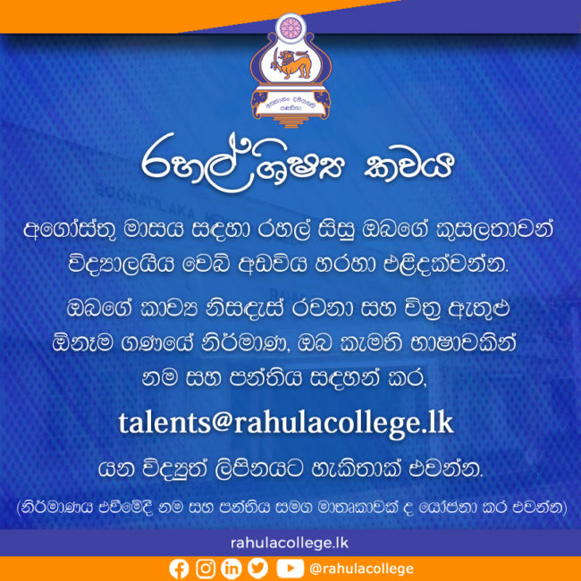 ඔබගේ කුසලතාවන් රාහුල විද්යාලයීය වෙබ් අඩවිය හරහා එළිදක්වන්න අවස්ථාවක්… ඔබගේ කාව්,ය නිසඳැස්, රචනා සහ චිත්ර ඇතුළු ඕනෑම ගණයේ නිර්මාණ, ඔබ කැමති භාෂාවකින් නම සහ පන්තිය සදහන් කර webteam [at] rahulacollege.lk විද්යුත් ලිපිනයට එවන්න රහල් ශිෂ්ය කවය වෙත පිවිසෙන්න: rahulacollege.lk/students-circle