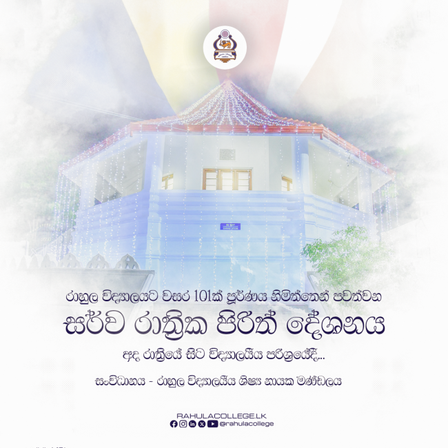 රාහුල විද්යාලයට වසර 101ක් සපිරීම නිමිත්තෙන් පවත්වන සර්ව රාත්රික පිරිත් දේශනය 1 - 5 ශ්රේණි, 12 - 13 ශ්රේණි, 6 - 11 ශ්රේණි, දැන්වීම් පුවරුව, විශේෂාංගBy Chalana Nethsaraඅප්රේල් 30, 2024