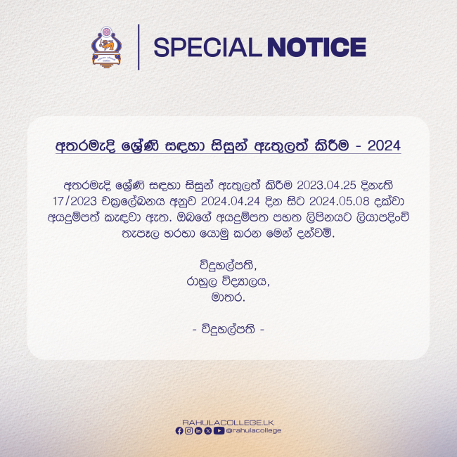 අතරමැදි ශ්රේණි සඳහා සිසුන් ඇතුලත් කිරීම – 2024 1 - 5 ශ්රේණි, 12 - 13 ශ්රේණි, 6 - 11 ශ්රේණි, දැන්වීම් පුවරුව, විශේෂාංගBy Chalana Nethsaraමැයි 5, 2024