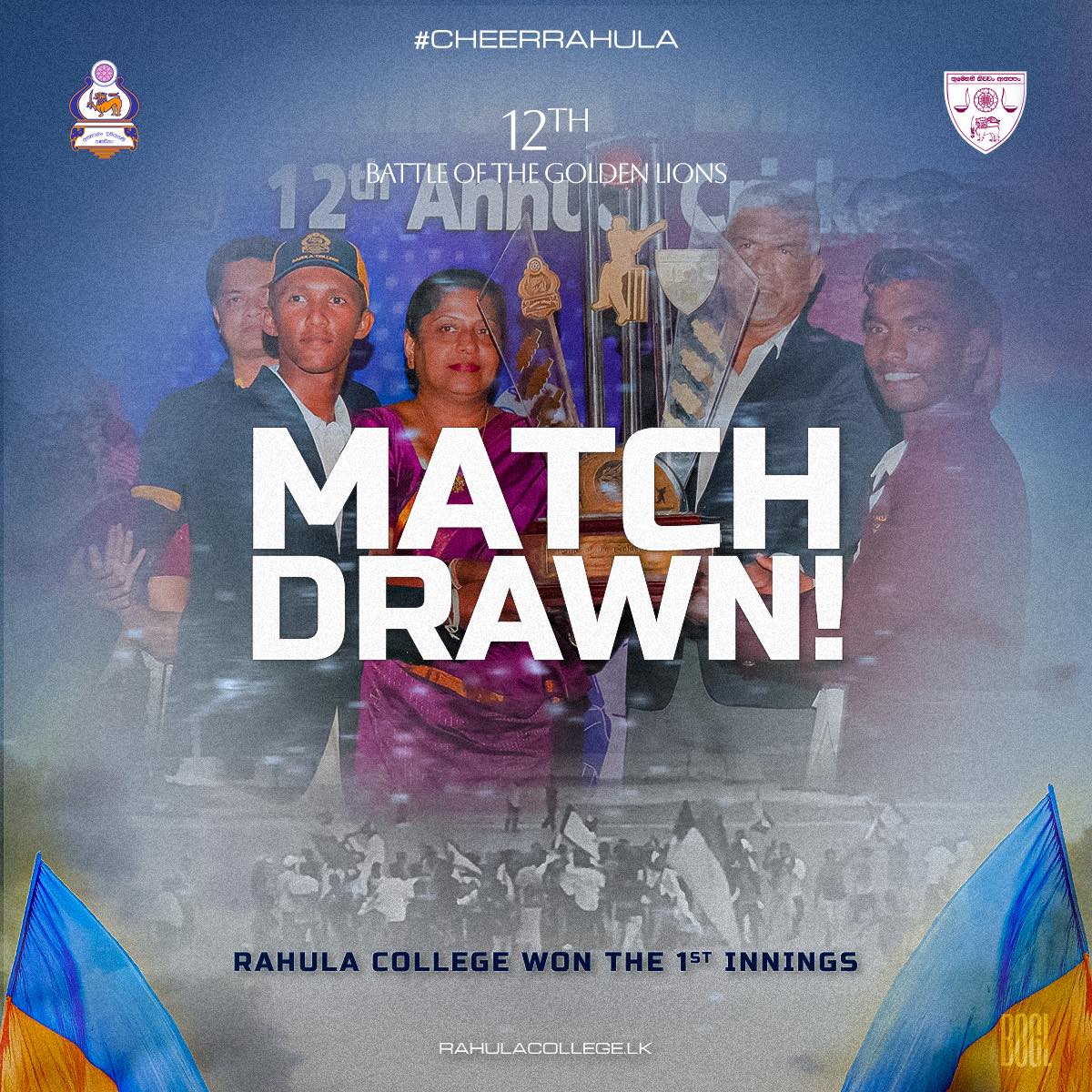 රාහුල විද්යාලය හා පන්නිපිටිය ධර්මපාල විද්යාලය අතර වාර්ෂික මහා ක්රිකට් තරගය, රන් සිහ සටන 2023 ජය පරාජයෙන් තොරව අවසන් විය. මුල් ඉනිමේ ජය රාහුල විද්යාලයට හිමි විය.