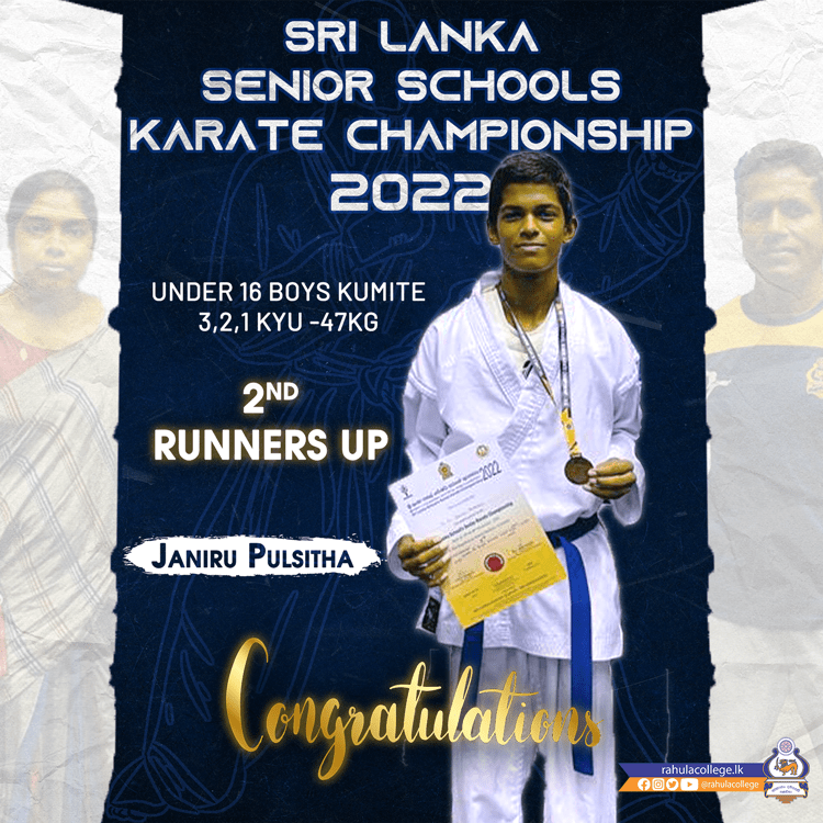 ශ්රී ලංකා ජ්යේෂ්ඨ පාසල් කරාටේ ශූරතාවලිය 2022 හීදී ජනිරු පුල්සිත සිසුවා 16 පහළ බාලක කුමිතේ ඉසව්වෙන් 3න් වන ස්ථානය ජයග්රහණය කරන ලදී.